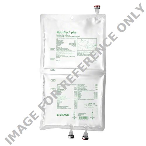 Parenteral nutrition solution containing amino acids, glucose, and electrolytes in a two-chamber bag.
