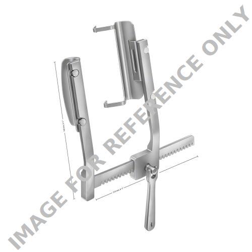 This spreader can be used optionally in cranial or caudal position. As the retractor is used in cranial position the bend up arms show away from the patient´in order to protect the neck form pressure.
