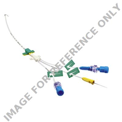 Antimicrobially modified triple-lumen catheter: Soft catheter tip / X-ray detectable, opaque / Three lumen: distal = 16 G; middle = 18 G; proximal = 18 G / Length markings / Color-coded Luer-Lock hubs / Fixation wings at the channel junction for securing the catheter